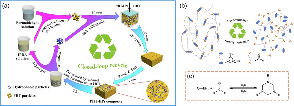 To date, the major competition in the field of superhydrophobic materials is to keep improving their durability. However, the accumulation of robust superhydrophobic materials may lead to serious environmental issues because they can be mechanically, chemically, and thermally stable but are not degradable. To tackle this challenge, we designed a durable superhydrophobic composite by integrating hydrophobic nanoparticles into polyhexahydrotriazine (PHT) – a polymer that can be dissolved and recycled by strong acids. In addition to its exceptional mechanical and thermal durability, the composite is chemically stable because the PHT is under the protection of hydrophobic nanoparticles on the surfaces so that the material cannot be wetted and is stable when being exposed to corrosive solutions. Ethanol was used as the “key” to initiate the recycling process; the composite is pre-wetted by ethanol, which facilitates the contact between PHT and acids, so that the robust superhydrophobic composite can be decomposed and recycled.